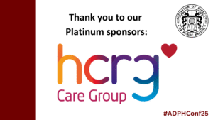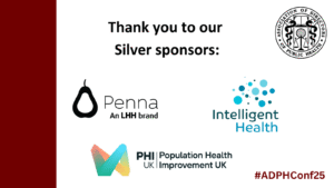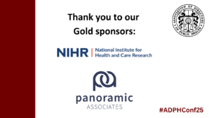 Thank you to our sponsors, HCRG, GSK, NIHR, Panoramic Associates, Intelligent Health, Penna, and PHIUK. Please note that none of our sponsors have had any input or control over any aspects of the conference, including the agenda or speaker selection, which have been developed by ADPH in partnership with our members.