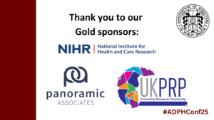 Thank you to our sponsors, HCRG, NIHR, Panoramic Associates, UKPRP, Intelligent Health, Penna, and PHIUK. Please note that none of our sponsors have had any input or control over any aspects of the conference, including the agenda or speaker selection, which have been developed by ADPH in partnership with our members.