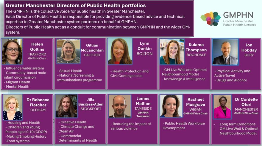 We are the 10 Directors of Public Health, utilising our independent professional autonomy collaboratively with our partners from GM NHS ICB, UKHSA, DHSC, GMCA, the VCFSE and other public health professionals from across the system. With a small core team of staff, together we drive forward our shared objectives and gain assurance around our core public health business deliverables.
